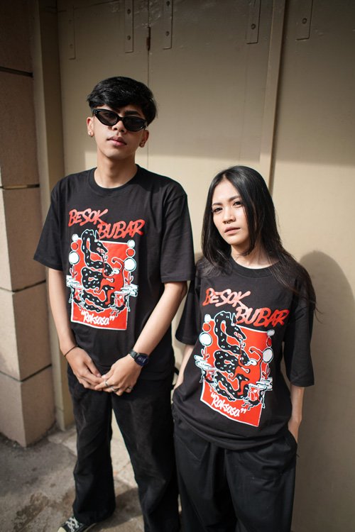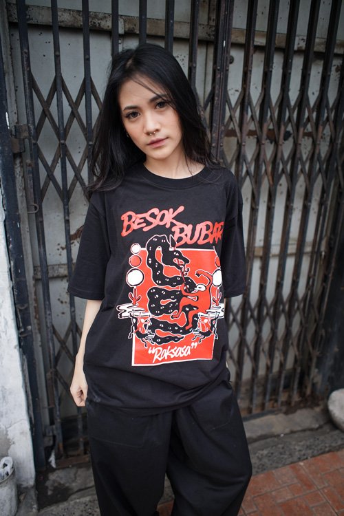 Gak cuma sound, Besok Bubar juga all-out di merchandise. Mereka menggandeng brand clothing asal Bandung, Rockrunner, untuk merilis T-shirt eksklusif. Seluruh artwork keren untuk rilisan ini dikerjakan oleh Jooibooi Studioyang berhasil menerjemahkan pesan “Raksasa” ke dalam visual yang kuat.