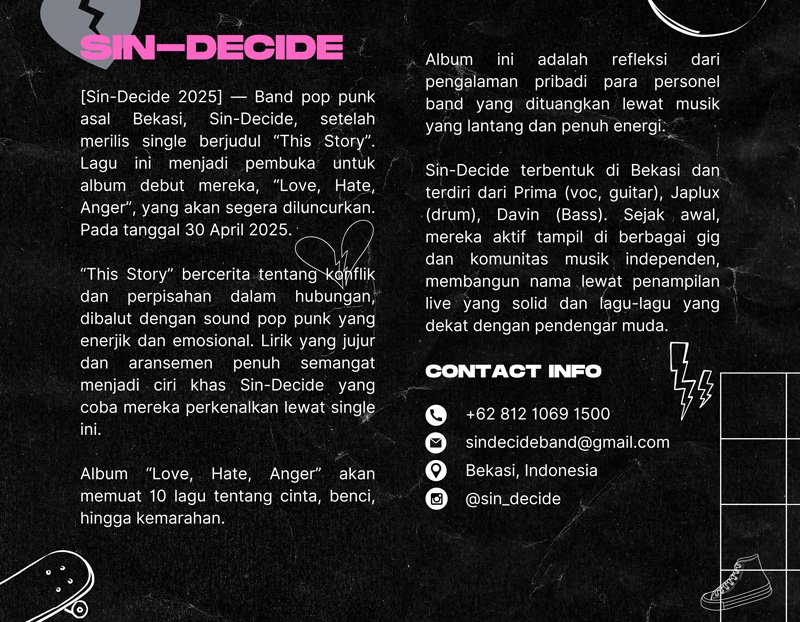 SIN DECIDE // ALBUM LOVE HATE ANGER Post author:mavebali Post published:27/04/2025 Post category:Album / Music Post comments:0 Comments INFO:Contact person: 0812 1069 1500 | Instagram: @sin_decide Tags: lovehateanger, sindecide You Might Also Like ERROR CREW // “NODA DI ATAS PUTIHMU; KRITIK TAJAM UNTUK MUNAFIK BERKEDOK SUCI 11/06/2025 SPENCE LEE // SINGLE “FOUNDATION” 06/02/2024